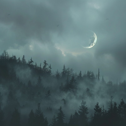 Above all this mist, above the trees, and into the night sky, a sliver of Moon tries to make itself known through the night clouds. Does it have a purpose, is there a rule about its shape and brightness that we either do not know about or do not care to know?